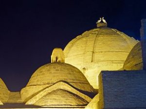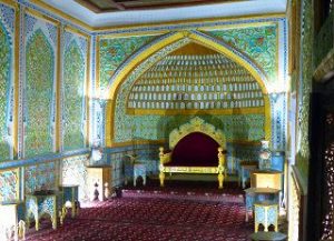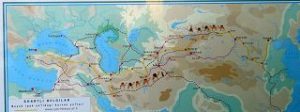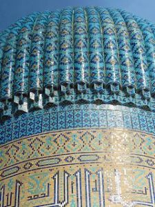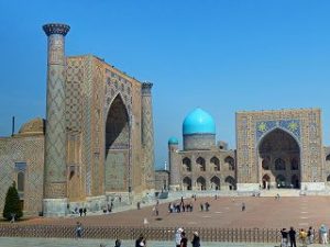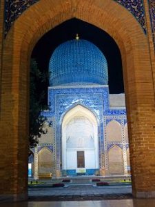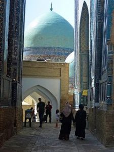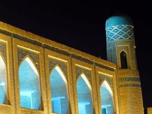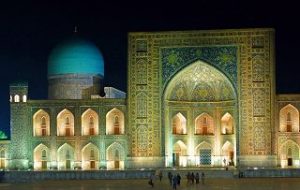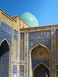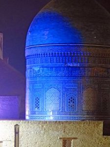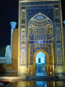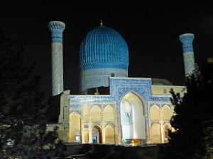 Die Seidenstrasse bringt uns in der Geschichte zurück in die Hauptstadt des Timuridenreiches Samarkand. Hier gründet Timur im späten 15. Jahrhundert mit vielen Feldzügen sein Großreich , das an Indien, Persien, Türkei und Russland angrenzt.Es entstehen Medresen – Koranschulen – Moscheen, und ganze Begräbnisstädte. Alle haben den typischen türkis-blauen Kachelschmuck und sind zumeist bestens renoviert, oft schon zu Zaren – oder Sowjetzeiten. Beleuchtet bei Nacht sind sie ein unvergessliches Erlebnis.